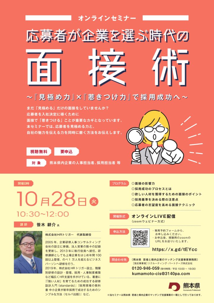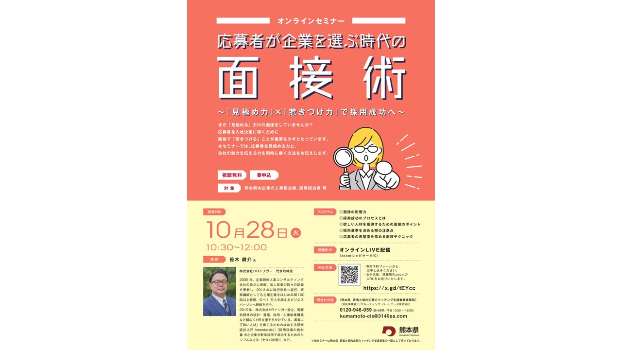 【熊本県内の企業様向け】10/28開催・オンラインセミナー『応募者が企業を選ぶ時代の面接術』登壇のお知らせ